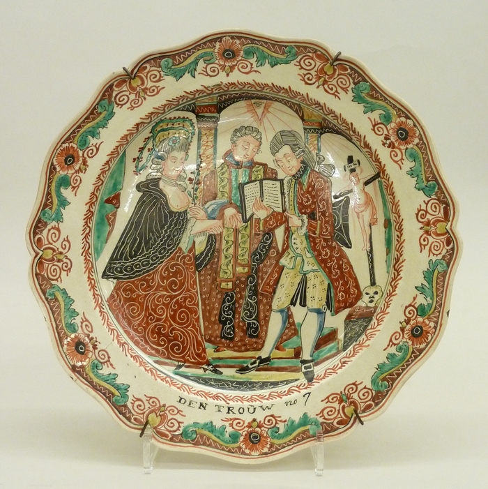Bord met "Den trouw no 7" uit een serie met voorstellingen der zeven sacramenten: het huwelijk