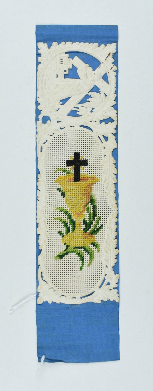 Bladwijzer met kruisdragende Christus in landschap en kelk met daarin een kruis