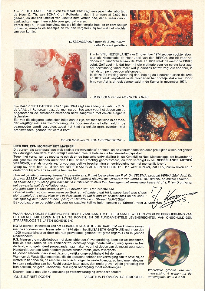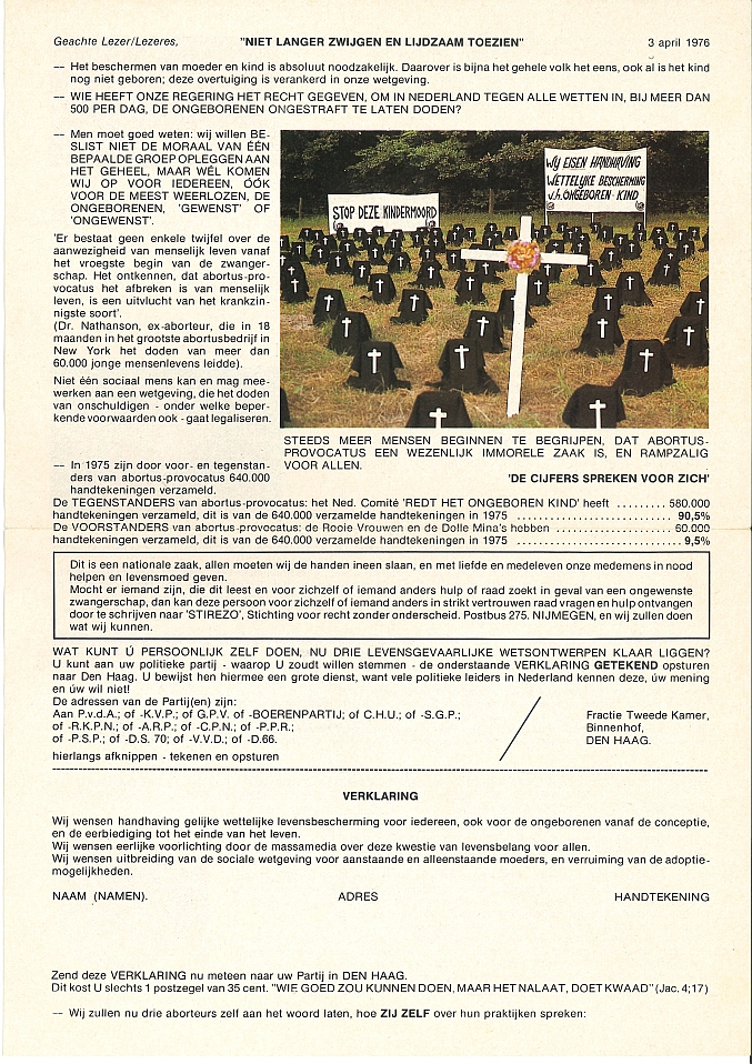 Folder "Niet langer zwijgen en lijdzaam toezien" met kleurenfoto's gericht tegen wettelijke regeling van de 'abortus provocatus', met op te sturen verklaring tegen deze regeling