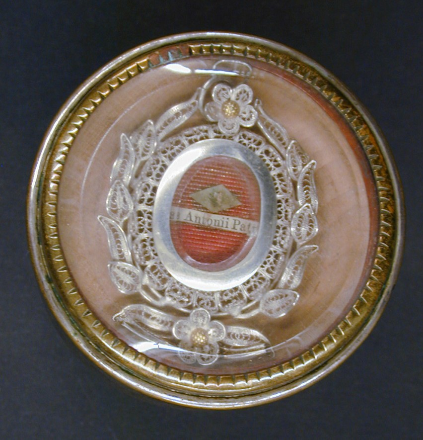 Ronde houder met relieken van de martelaren van Gorcum en St. Antonius, met slang als handvat