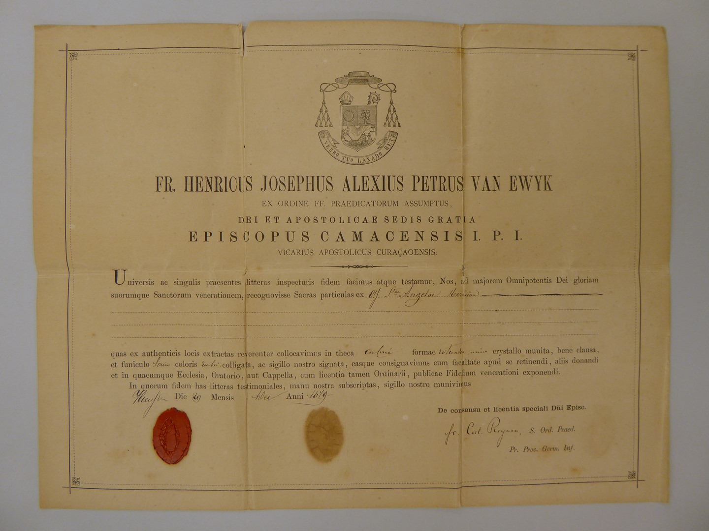 Echtheidsverklaring bij reliek van H. Angela, getekend door Fr. Henricus Josephus Alexius Petrus van Ewyk
