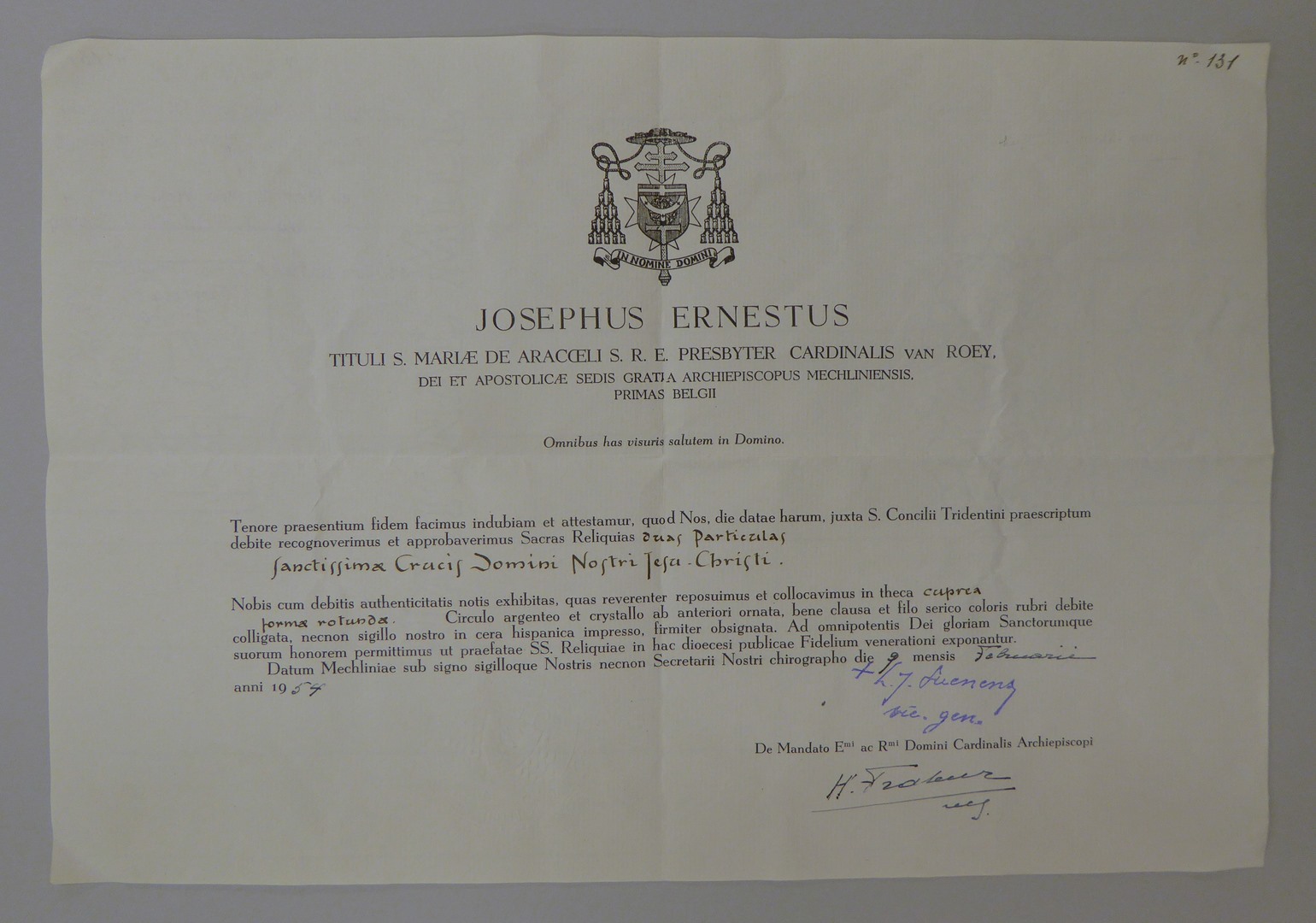 Echtheidsverklaring bij reliek van het H. Kruis, getekend door Josephus Ernestus