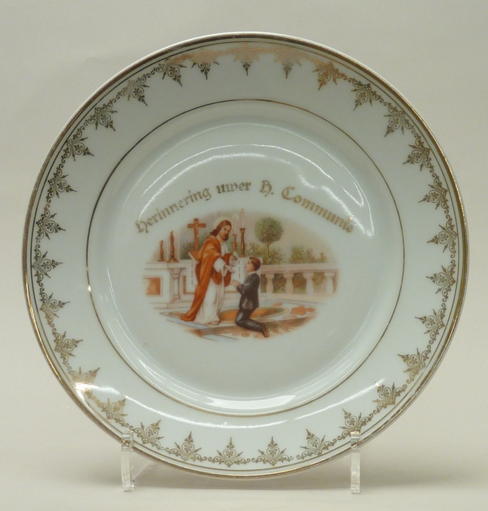 Ontbijtbordje Eerste-Communie-servies met Christus die aan een jongetje de communie uitreikt