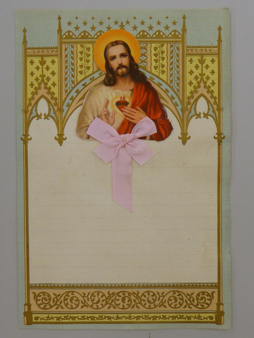 Dubbel blad met uitgeknipte druk van Heilig Hart Christus bevestigd met roze strik