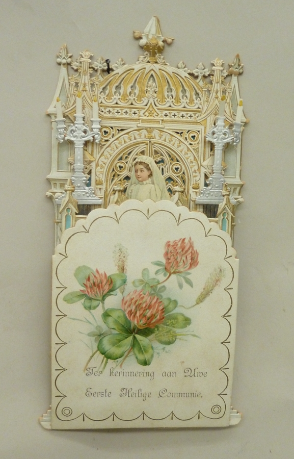 Communieklapprent met Mariavoorstelling en bruidje met kaars