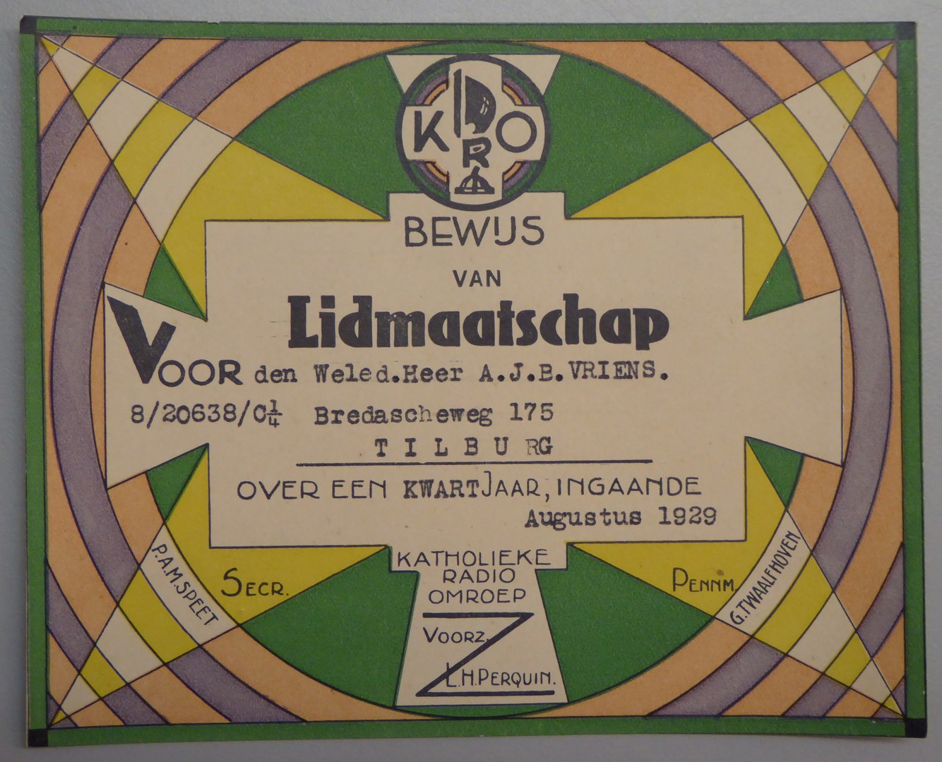 Lidmaatschapskaart van de Katholieke Radio Omroep (KRO) met "Bewijs van lidmaatschap ... Vriens"