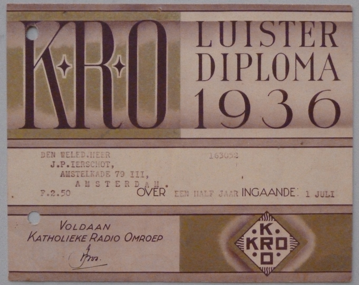 Lidmaatschapskaart van de Katholieke Radio Omroep (KRO) met "Luisterdiploma 1936 ... Ierschot ..."