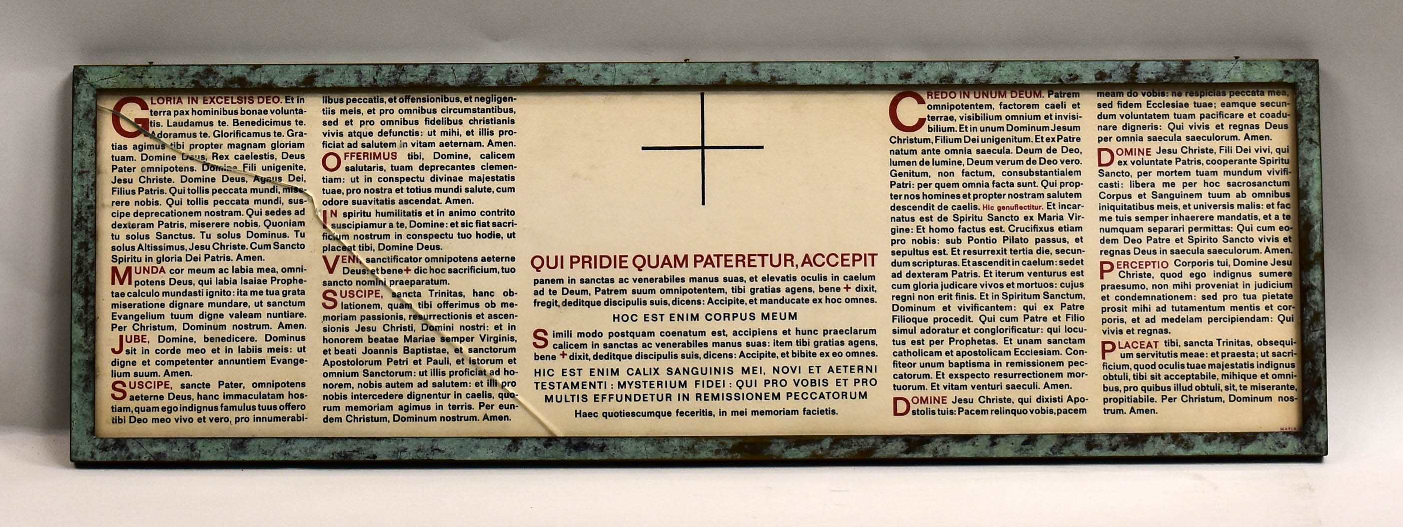 Canonbord met "Gloria in excelsis Deo ..." in lijst van groen koper