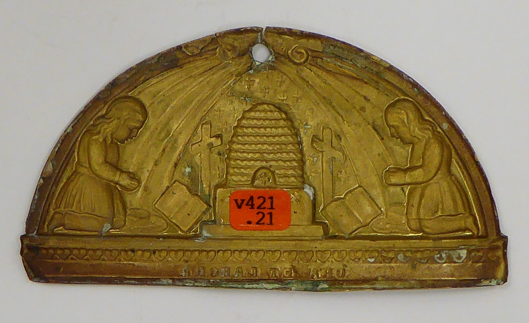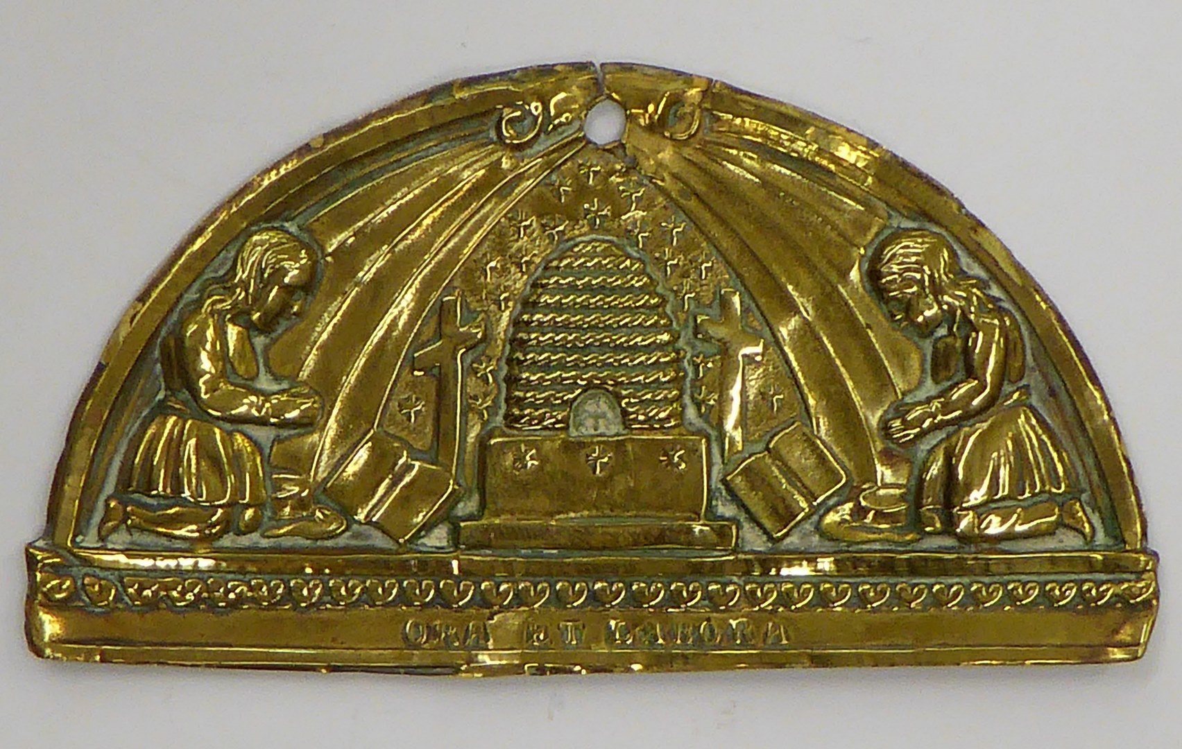 Koperen plaatje met biddende kinderen voor bijenkorf en "Ora et labora"