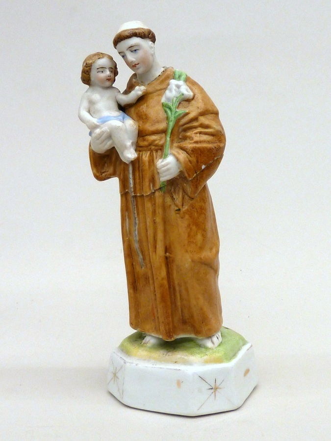 Antonius van Padua in monnikspij met lelie in linkerhand en kind op rechterarm