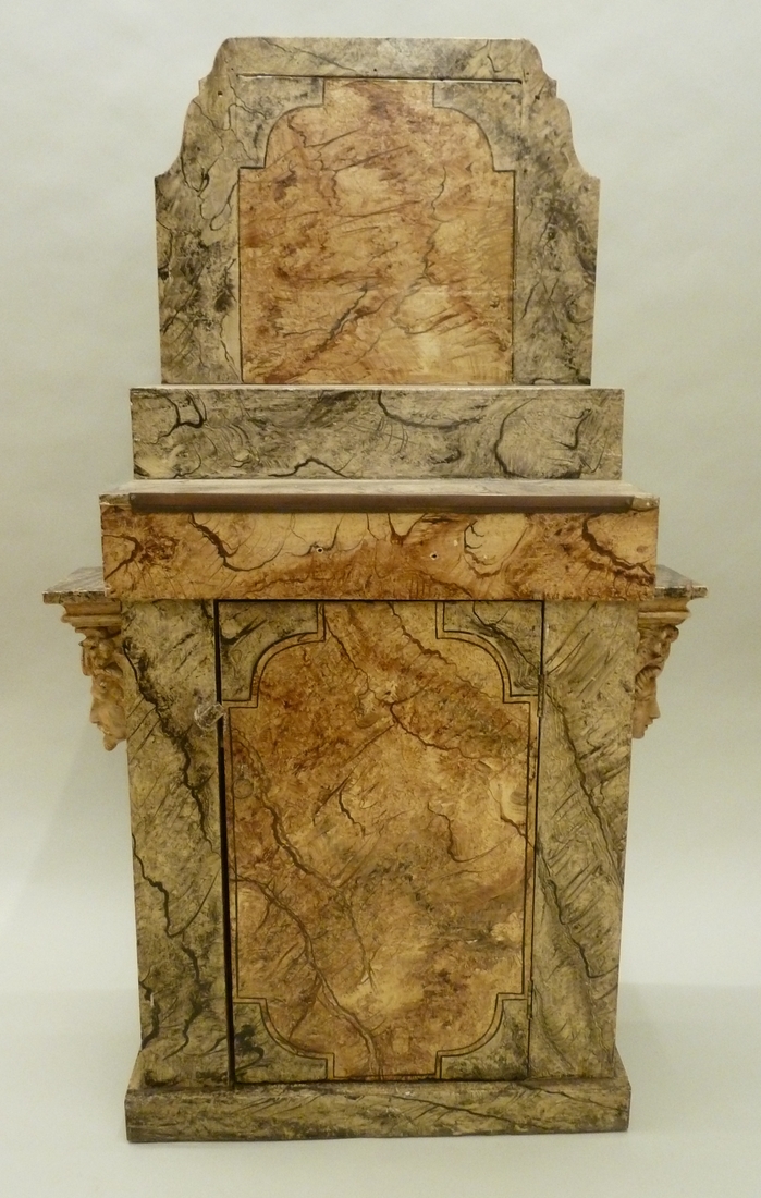 Gemarmerd speelgoedaltaar met ter weerszijden een gebeeldhouwde kop