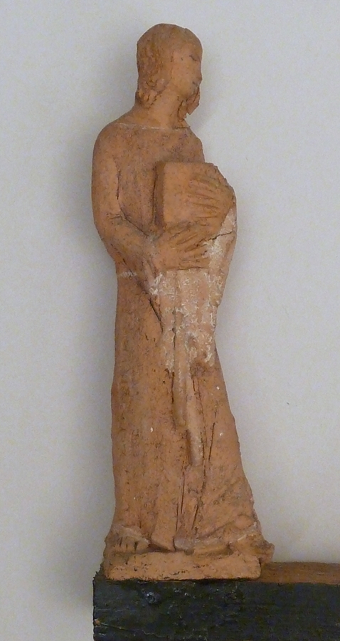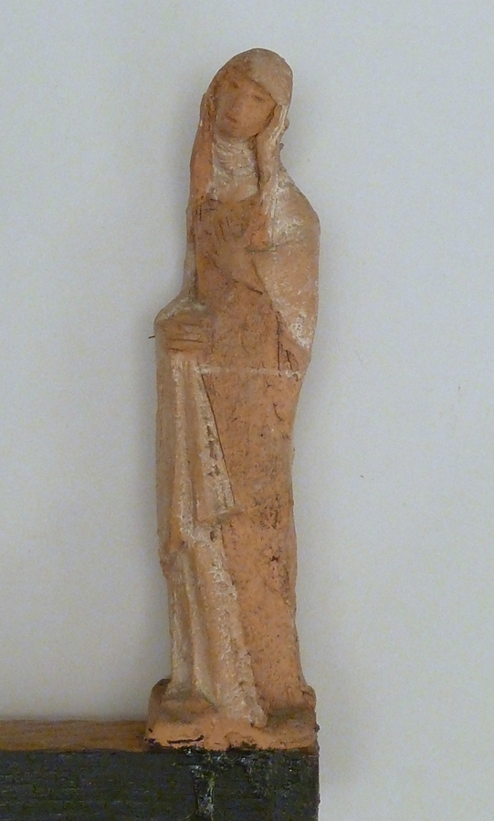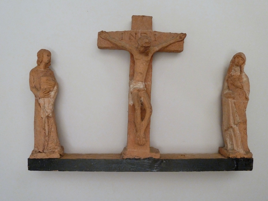 Drie terracotta beeldjes met gekruisigde Christus, Maria en Johannes, gemonteerd op plankje