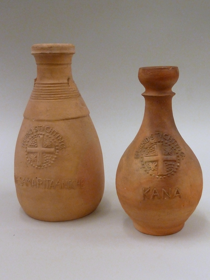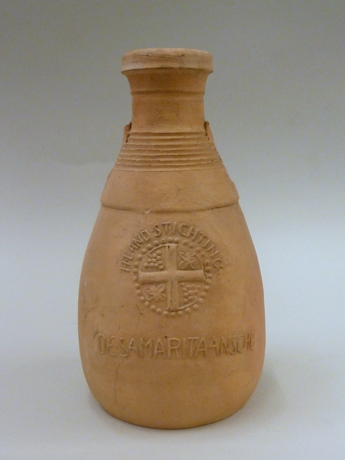 Kruik met afgebroken oren waarop "de Samaritaansche", kruis in cirkel met wijnbladeren
