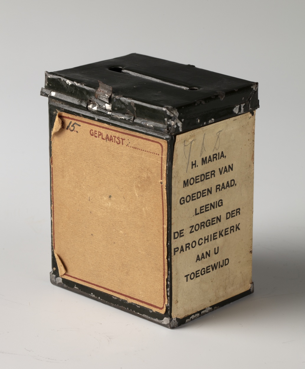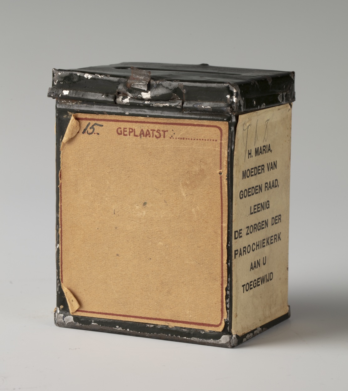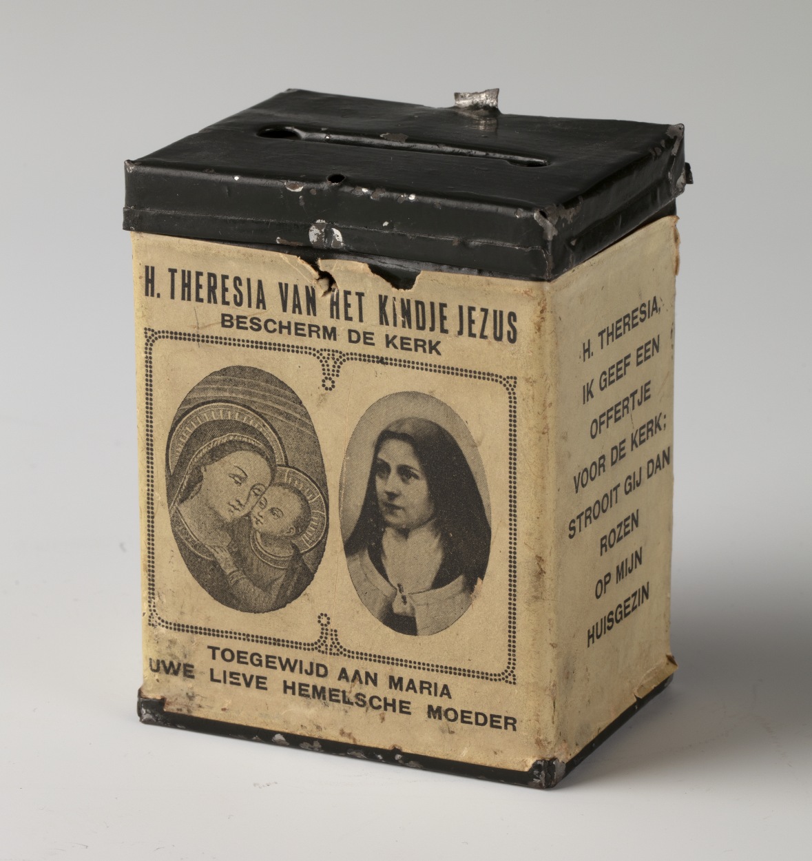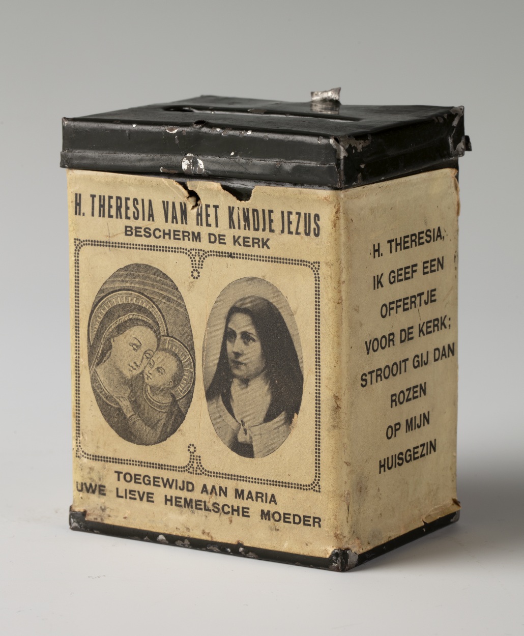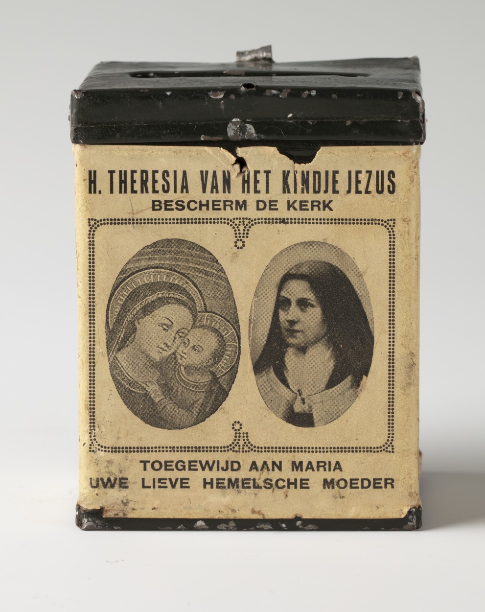 Offerbusje voor de parochie van Onze Lieve Vrouw van Goede Raad te Utrecht, met afbeeldingen van Maria met kind en Theresia van het kindje Jezus in ovaal
