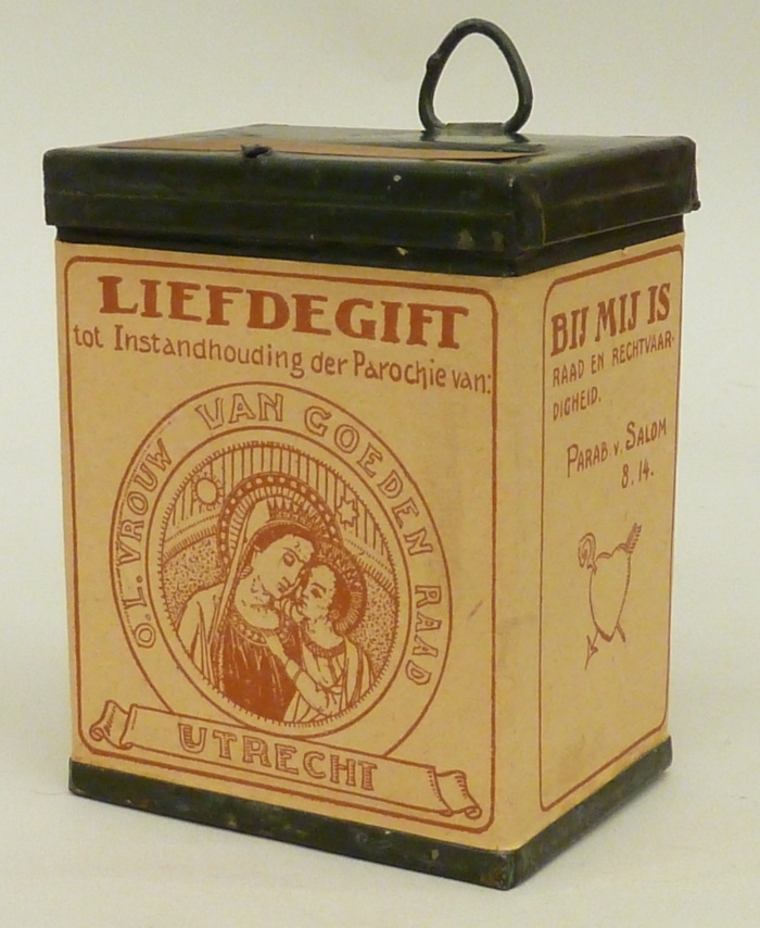 Offerbusje voor de parochie van Onze Lieve Vrouw van Goede Raad te Utrecht, met afbeelding Maria met kind en met "Liefdegift ..."