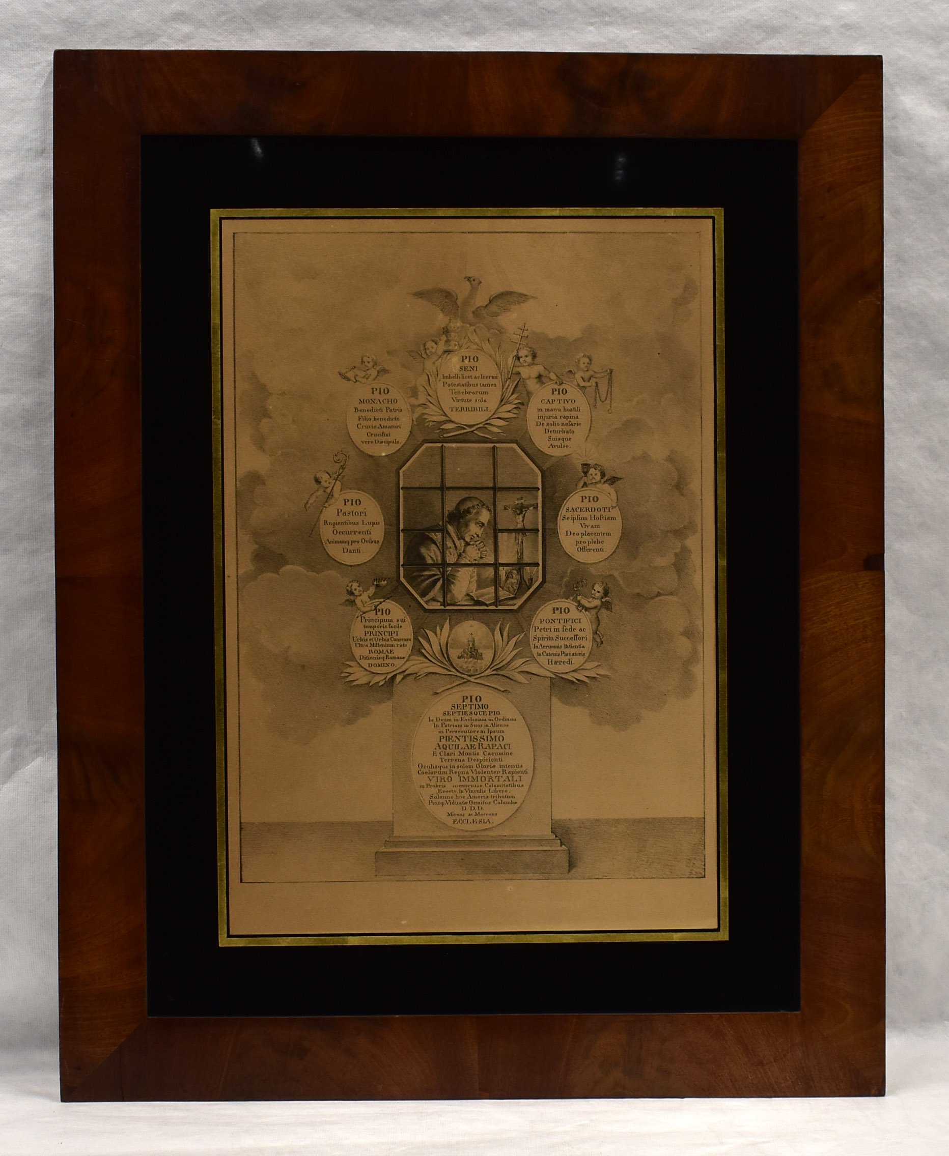 Memorieprent vanwege de dood van Pius VII met afbeelding paus, biddend achter tralie