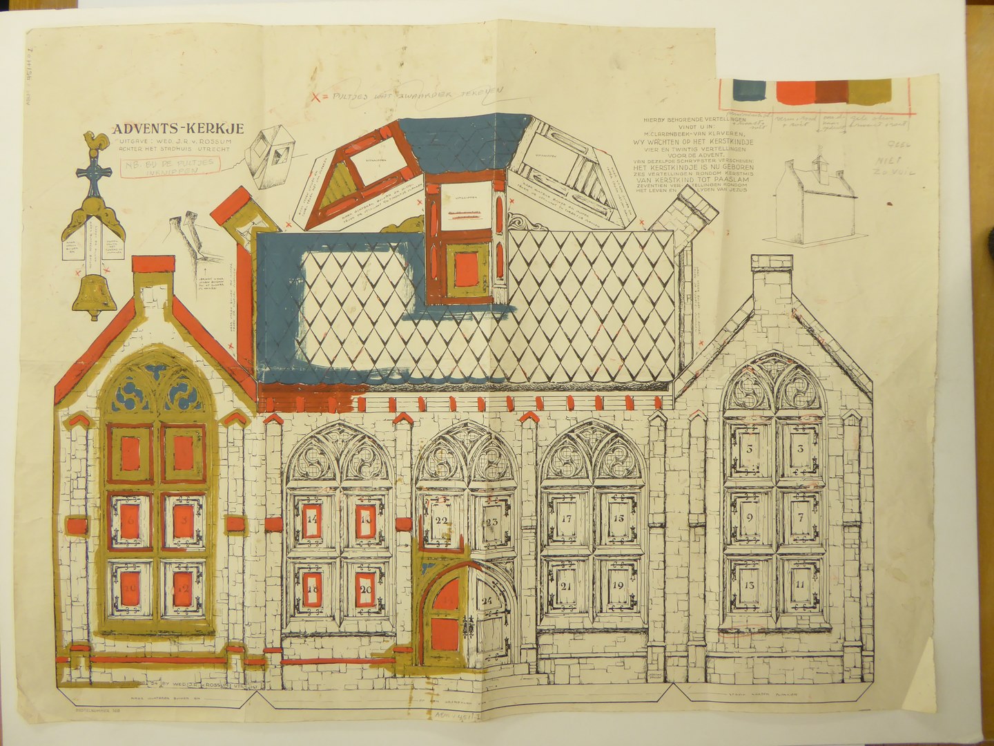 Ontwerp voor in elkaar te zetten adventskerkje met drukkersaanwijzingen