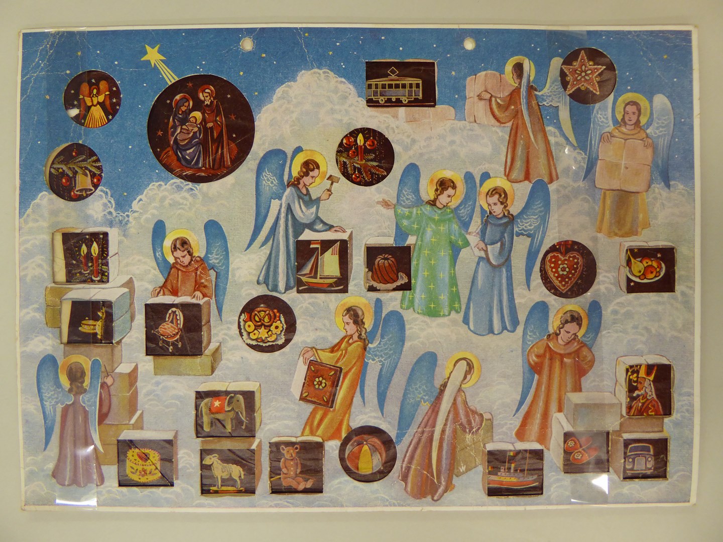 Voorplaat adventskalender met engeltjes die dozen in elkaar zetten