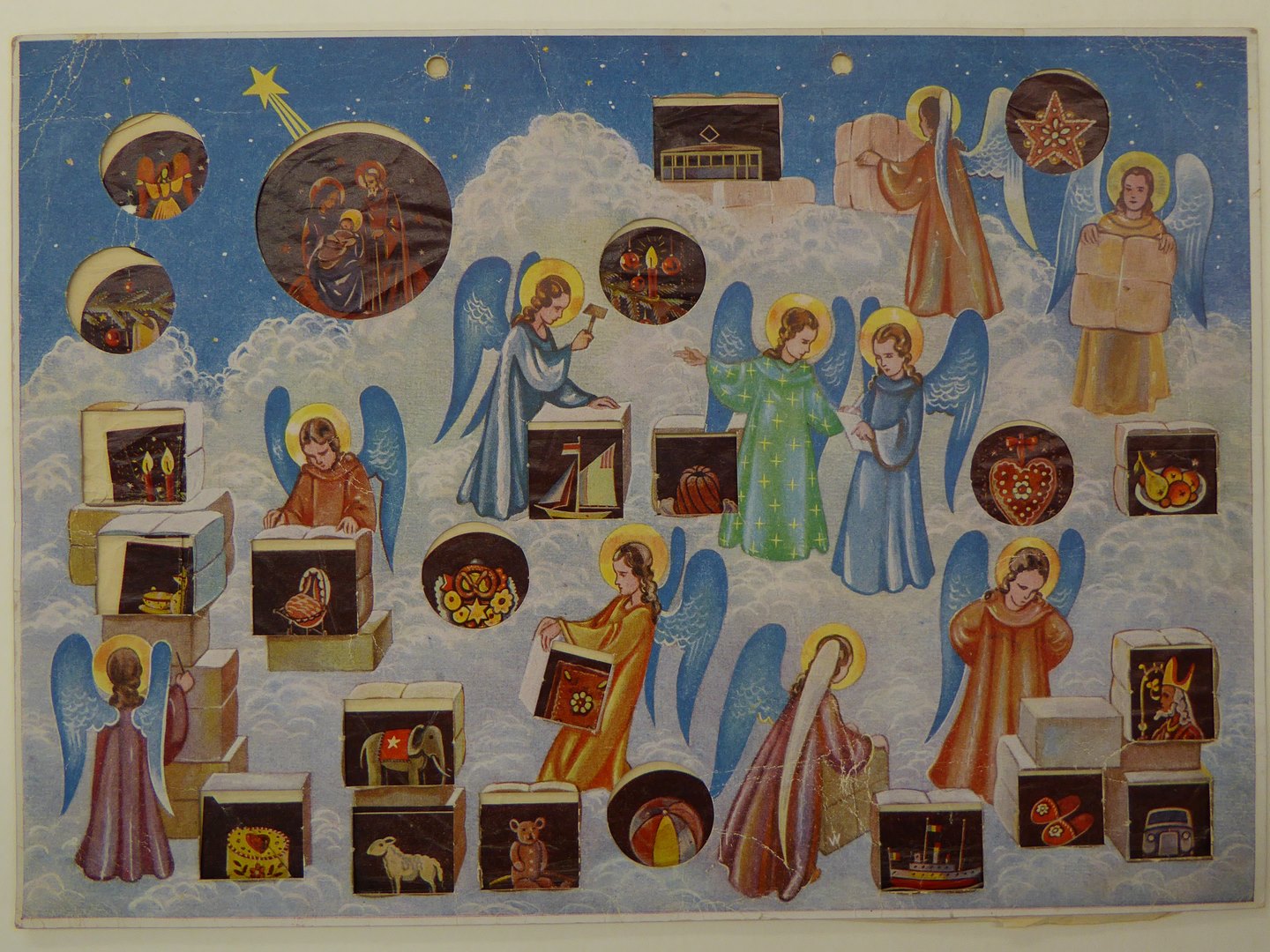 Achterplaat adventskalender met inhoud van de door engeltjes geassembleerde dozen