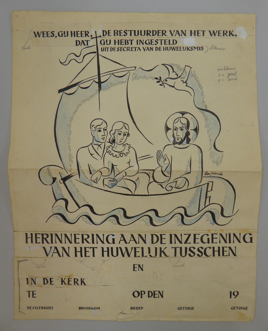 Tweede ontwerp huwelijksoorkonde met echtpaar in bootje met Christus aan het roer, boven/onder tekst