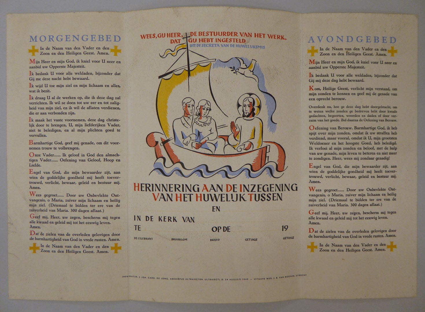 Huwelijksoorkonde met echtpaar in bootje met Christus aan het roer