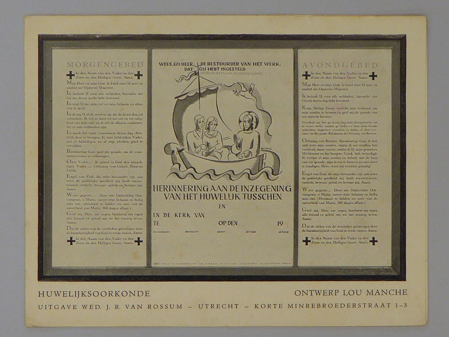 Reclamefolder voor huwelijksoorkonde met echtpaar in bootje met Christus aan het roer, druk in zwart
