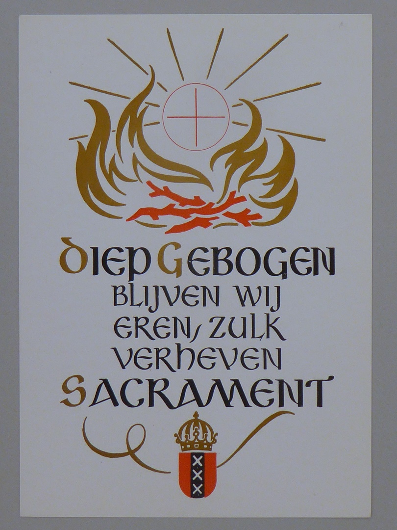 Prentbriefkaart met "Diep gebogen blijven wij eren, zulk verheven sacrament", naar illustraties uit boek 'Het Jaar des Heren'