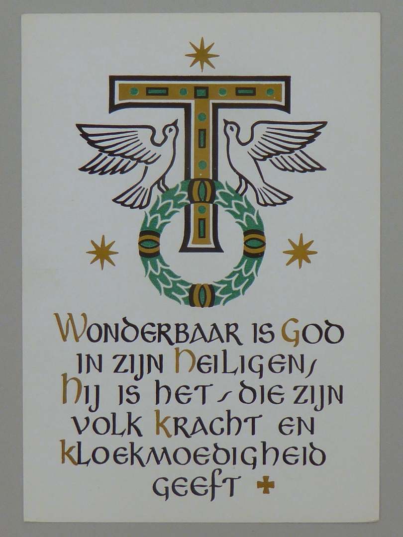 Prentbriefkaart met "Wonderbaar is God in zijn heiligen, hij is het, die zijn volk kracht en kloekmoedigheid geeft", naar illustraties uit boek 'Het Jaar des Heren'