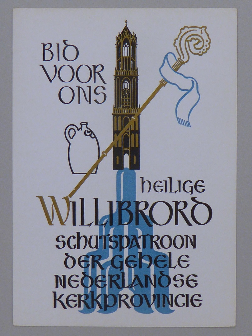 Prentbriefkaart met "Bid voor ons heilige Willibrord schutspatroon der gehele Nederlandse kerkprovincie", naar illustraties uit boek 'Het Jaar des Heren'