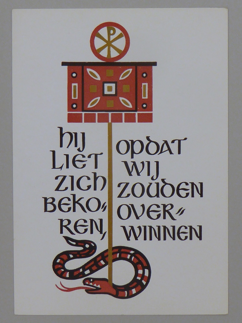 Prentbriefkaart met "Hij liet zich bekoren, opdat wij zouden overwinnen", naar illustraties uit boek 'Het Jaar des Heren'