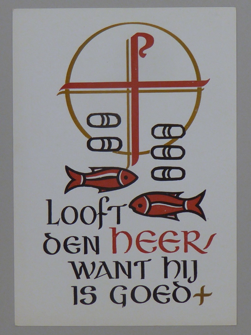 Prentbriefkaart met "Looft den Heer, want hij is goed", naar illustraties uit boek 'Het Jaar des Heren'