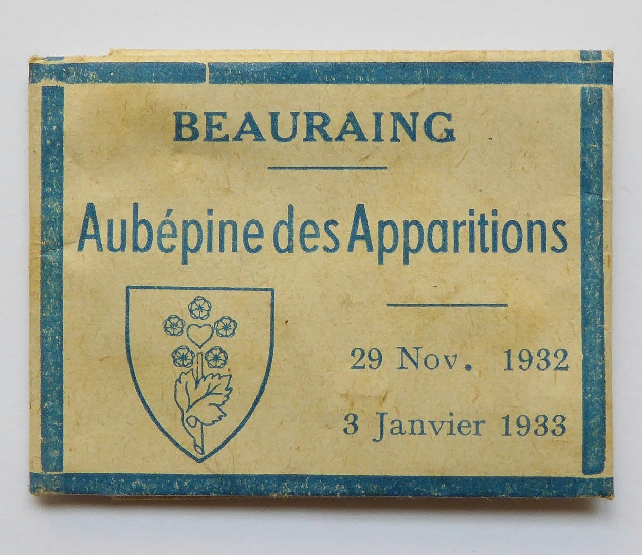 Meidoornblaadjes in papieren wikkel met "Beauraing, Aubépine des Apparitions ..."