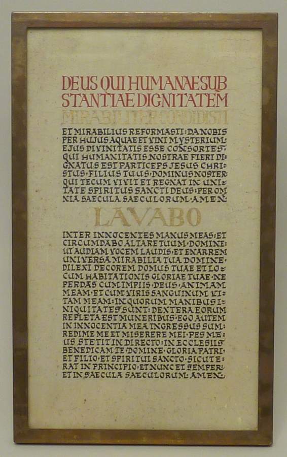 Canonbord op geschilderd hout met daarop gekalligrafeerde teksten in rood, goud en zwart