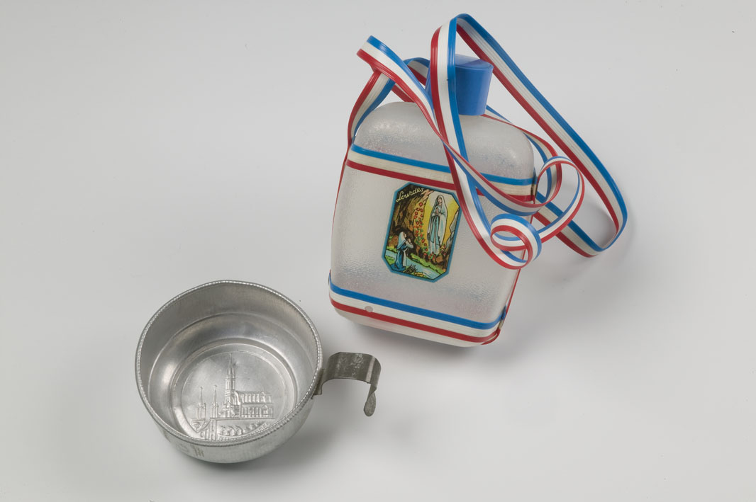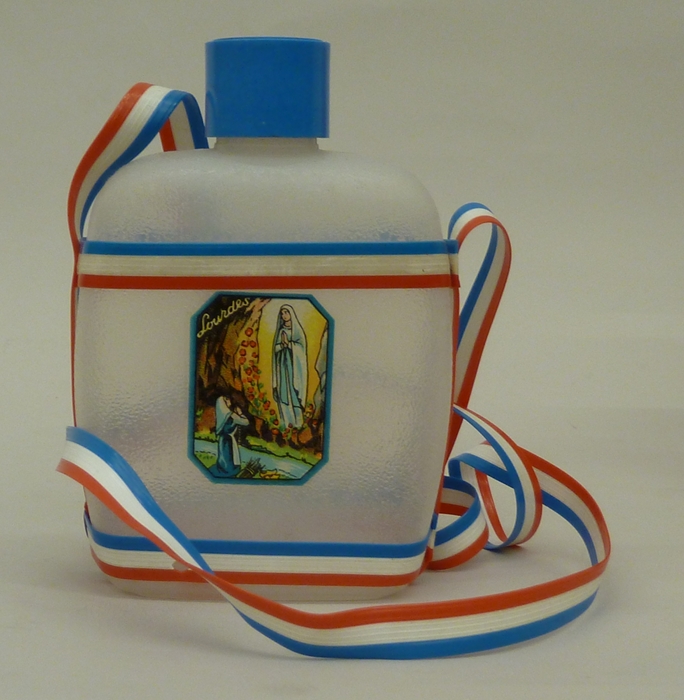 Kunststof veldfles aan rood-wit-blauwe band met afbeelding Mariaverschijning te Lourdes