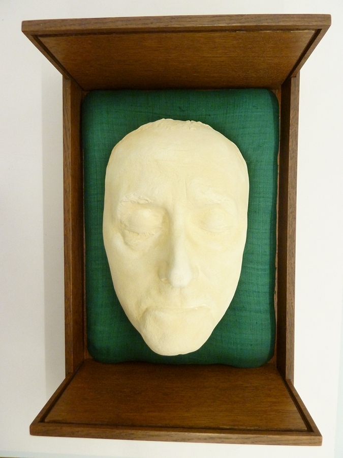 Dodenmasker van Mgr. H. van de Wetering in vitrinekastje