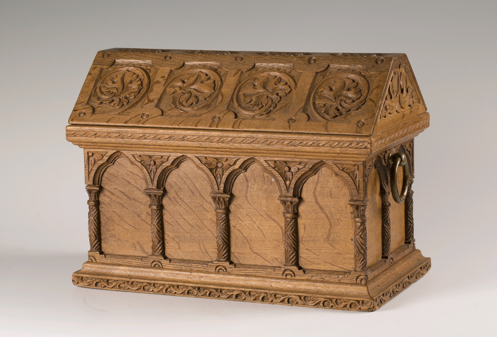 Reliekkist in vorm van gebouw met twee koperen draagringen, gebruikt bij kerk- en altaarwijding