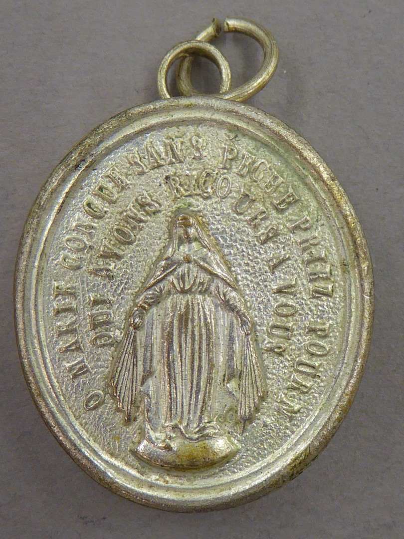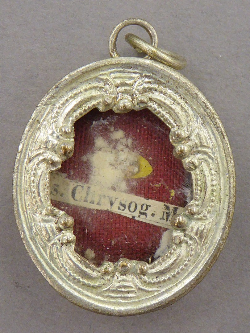 Reliekmedaillon met reliek van H. Chrysogonus van Aquileia, op achterzijde Maria