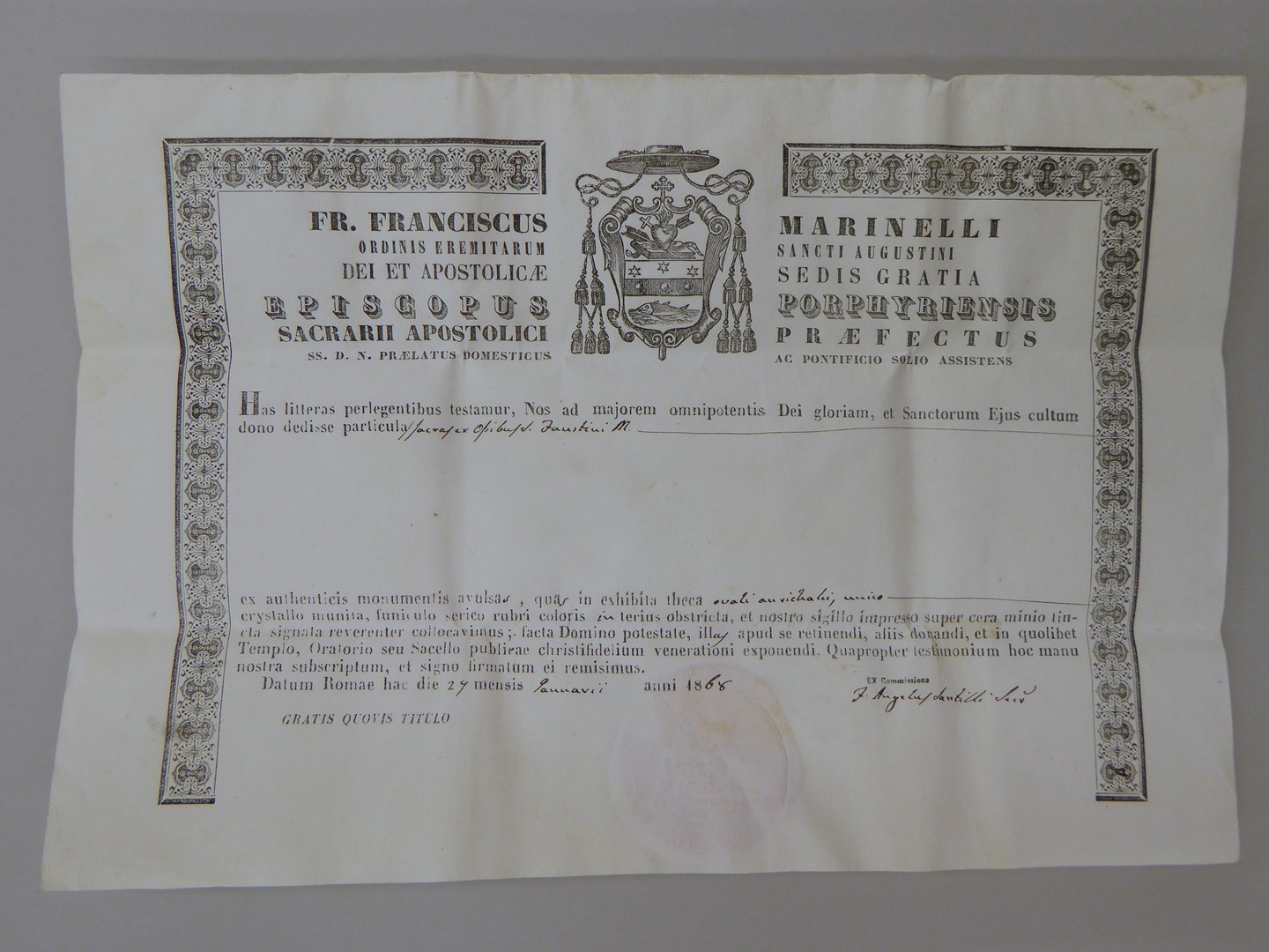 Echtheidsverklaring bij reliek van H. Faustinus
