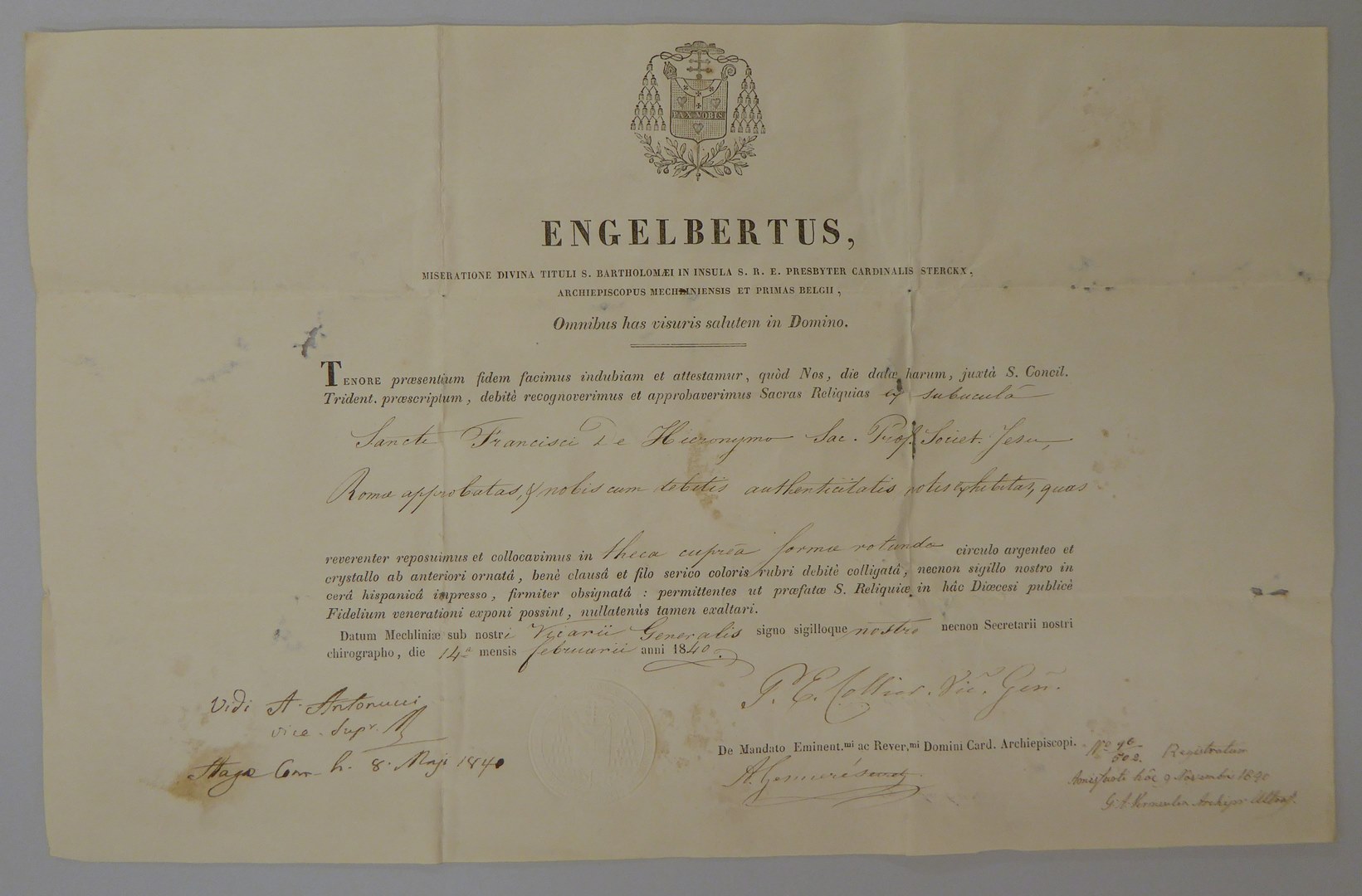 Echtheidsverklaring bij reliek van H. Franciscus van Hieronymo