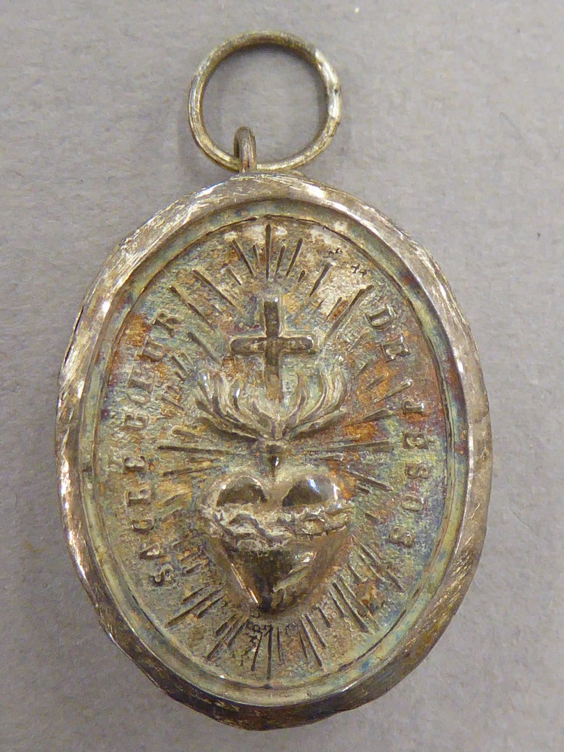 Reliekmedaillon met reliek van H. Marguerite Marie Alacoque, op achterzijde H. Hart met kruis