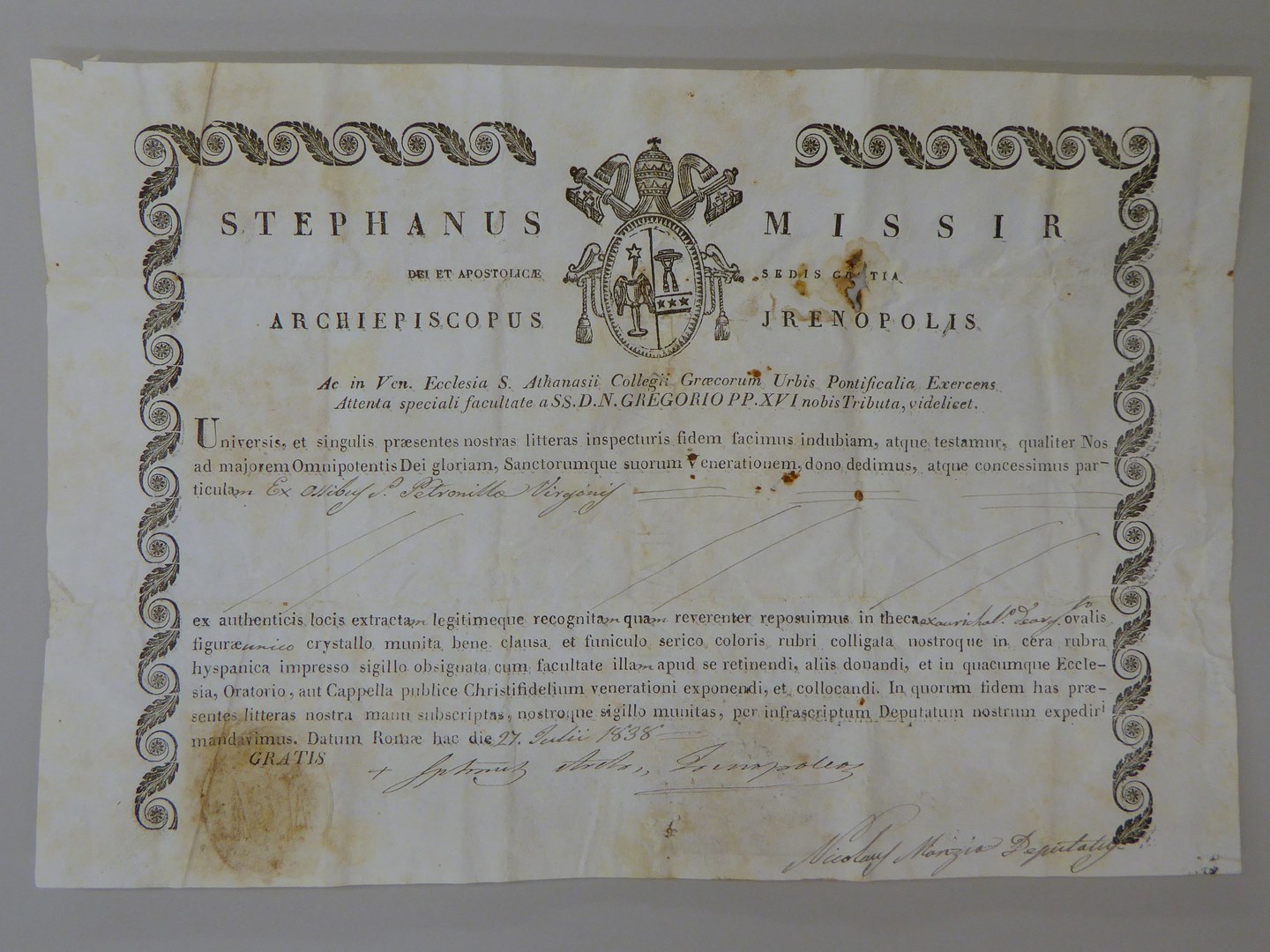 Echtheidsverklaring bij reliek van H. Petronilla van Rome