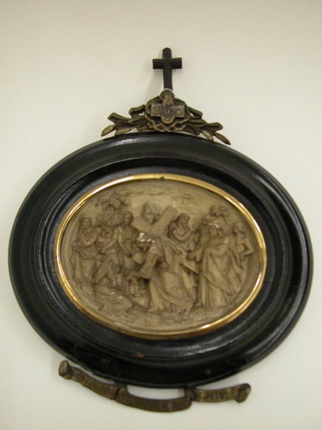 Ovaal reliëf achter glas met zesde kruiswegstatie: Veronica wist Christus' gezicht af
