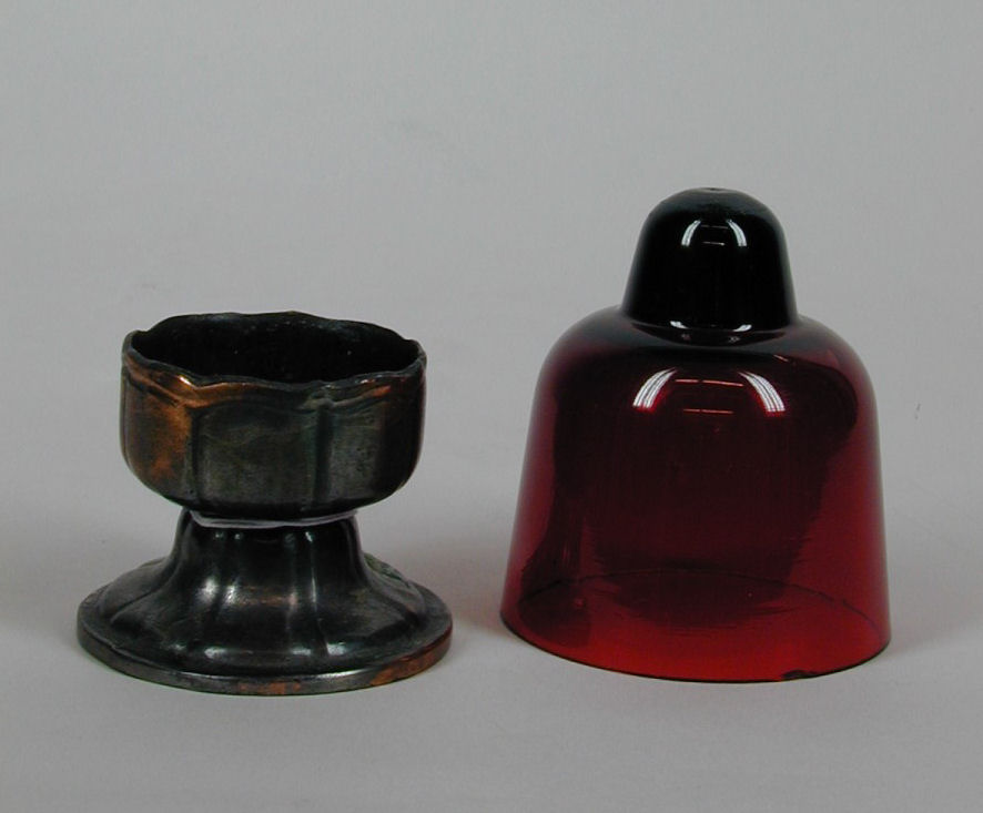 Devotielicht van rood glas op metalen voetstuk