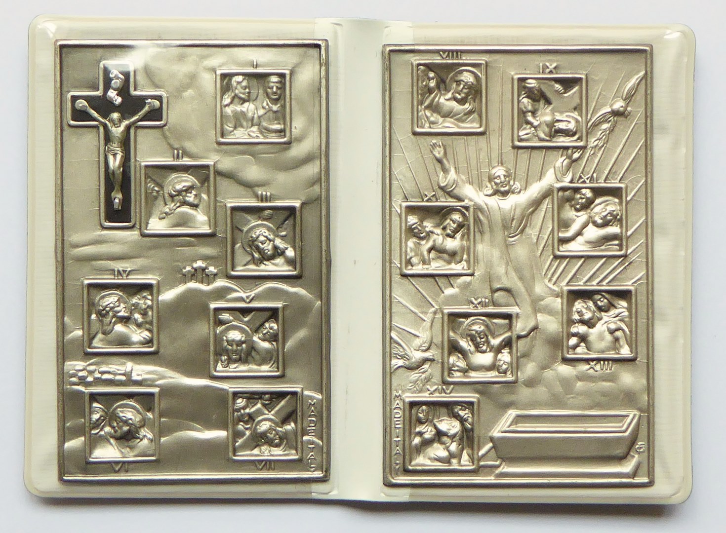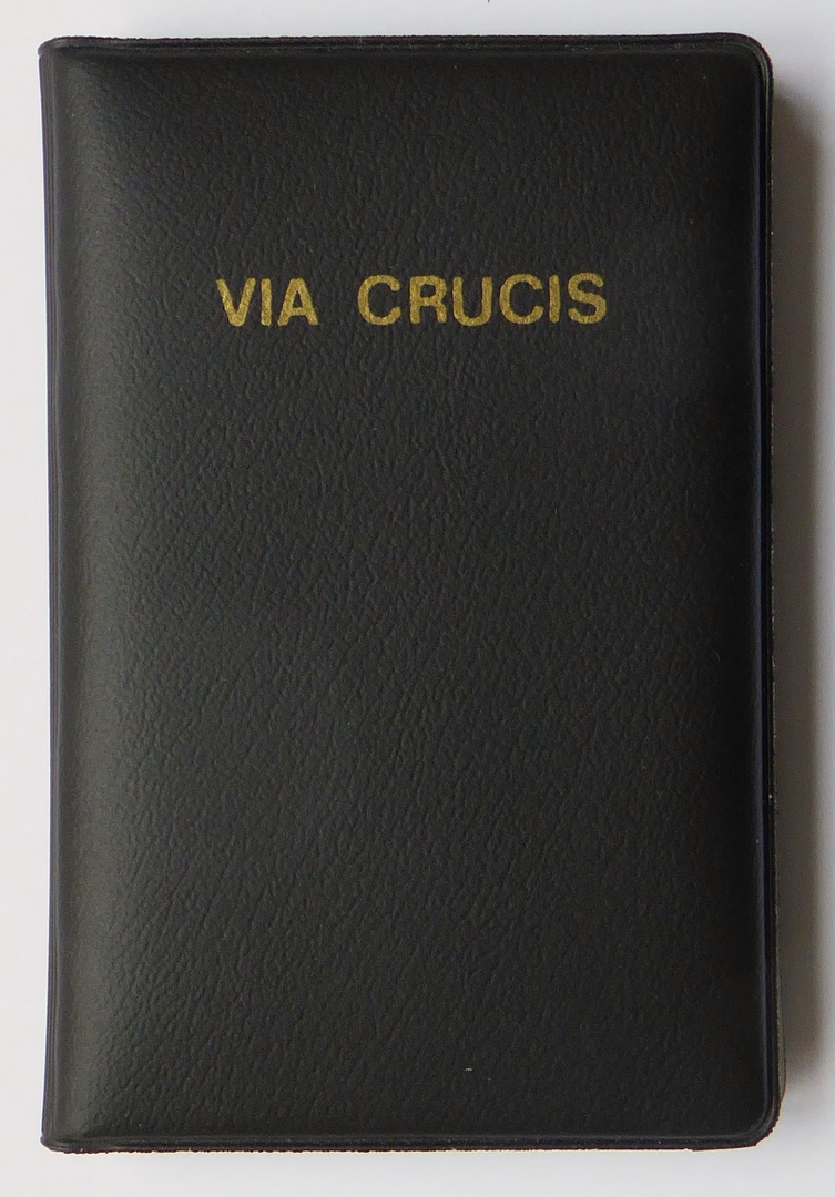 Zwart mapje met "via crucis" en twee reliëfplaatjes met 14 kruiswegstaties en crucifix