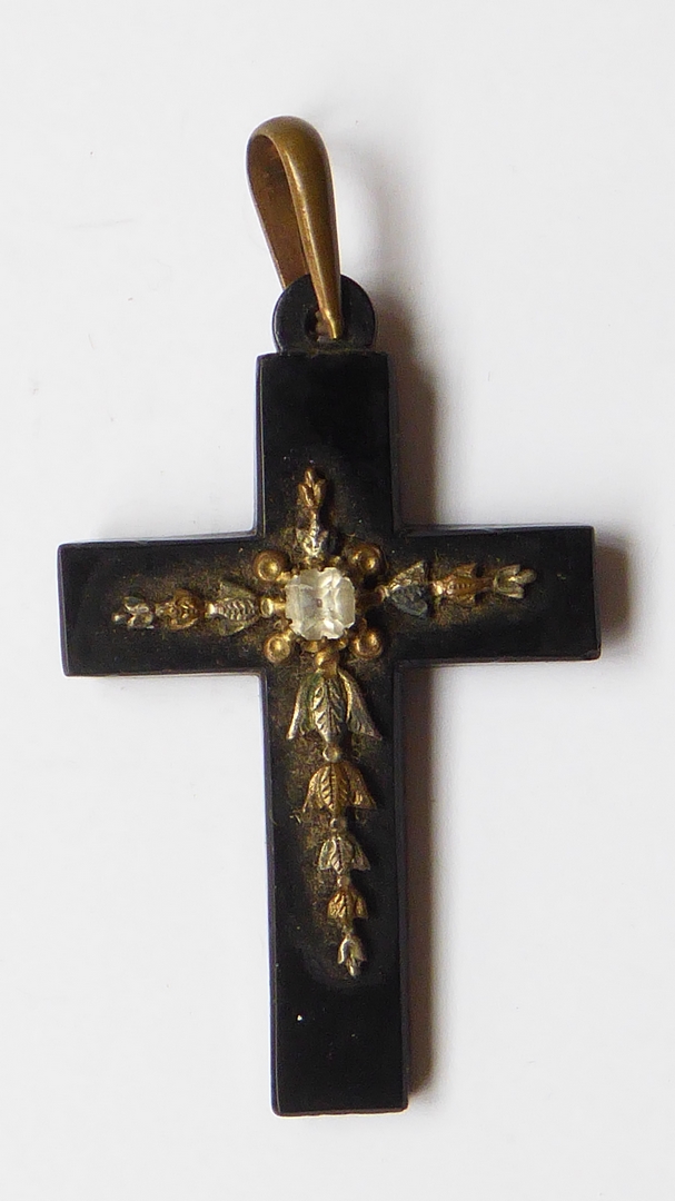 Zwart halskruisje met glassteen en culots (bloemkelken) in kruisvorm