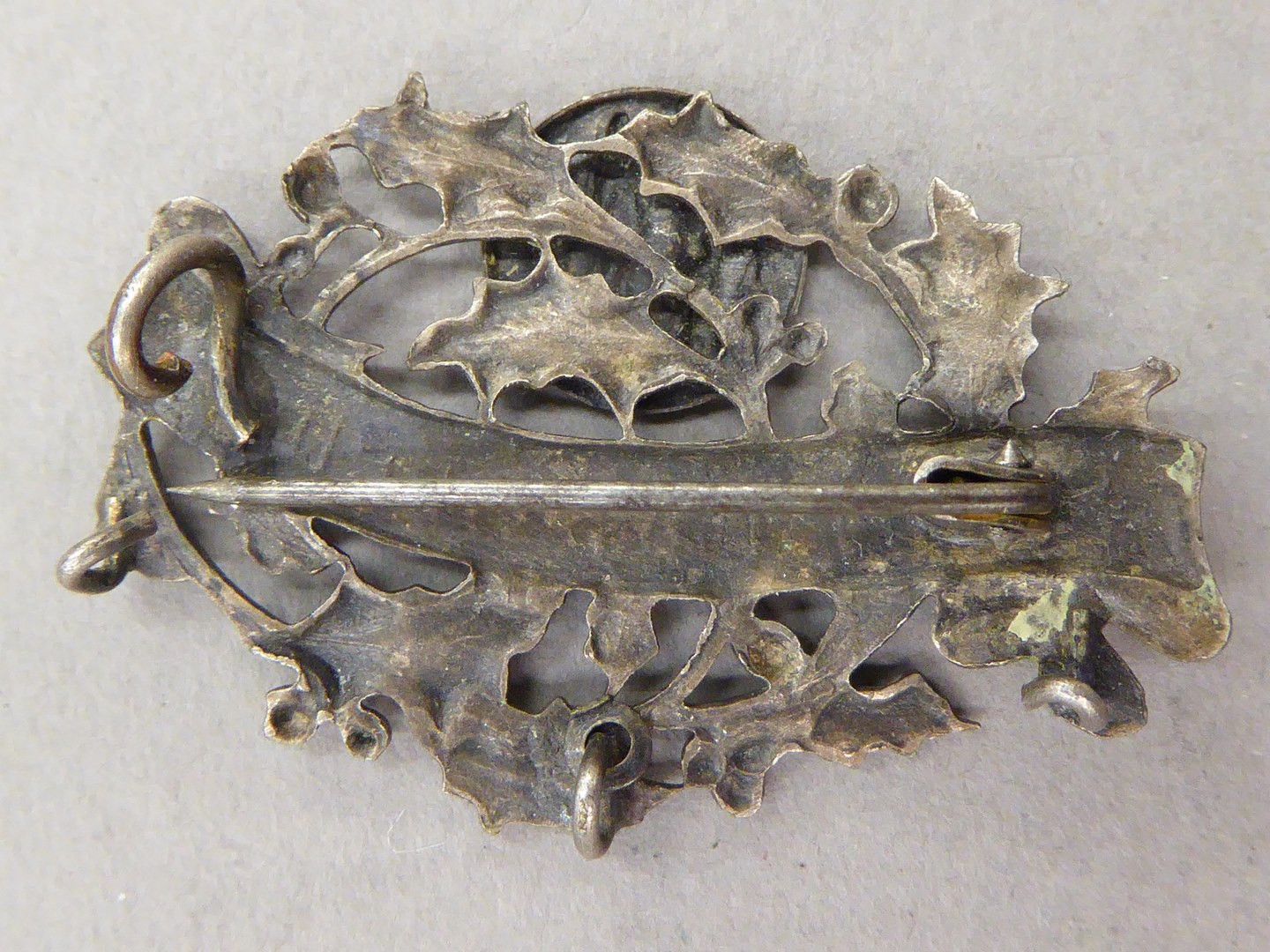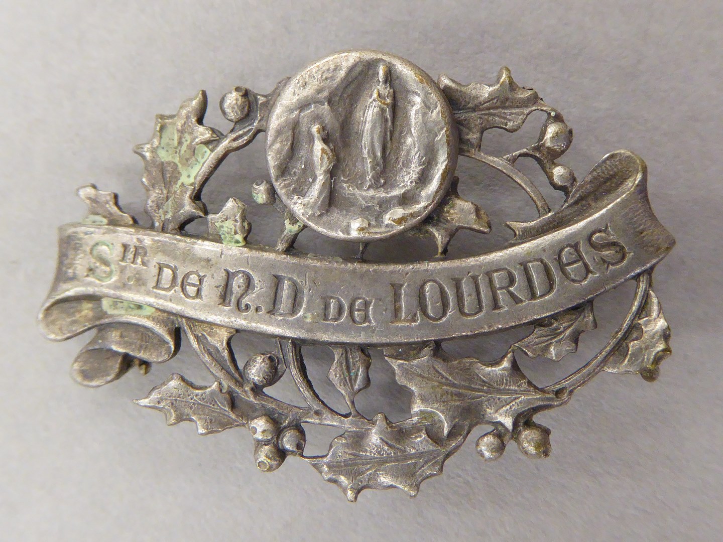 Zilverkleurige broche met verschijning van Maria aan H. Bernadette te Lourdes