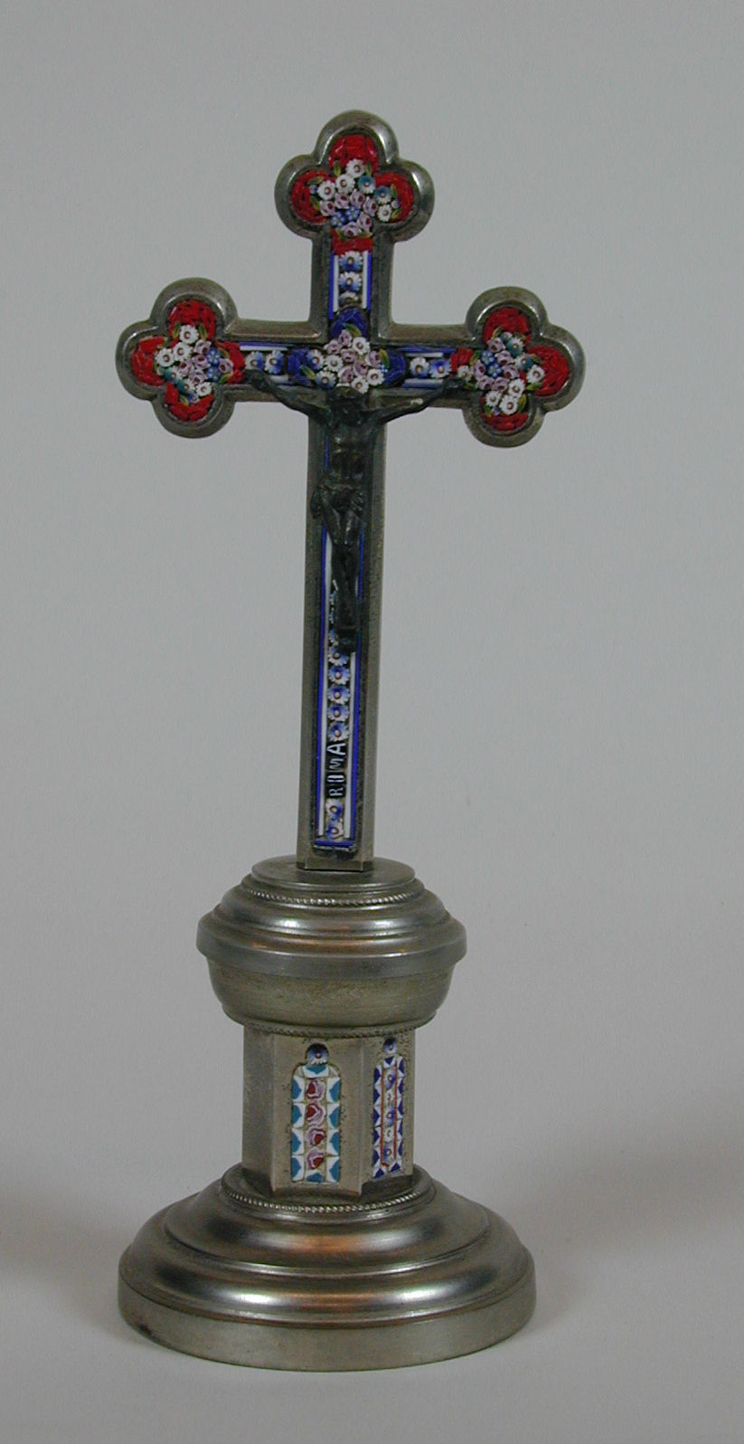 Kruis op ronde voet met klaverbladvormige uiteinden ingelegd met mozaïek, met corpus