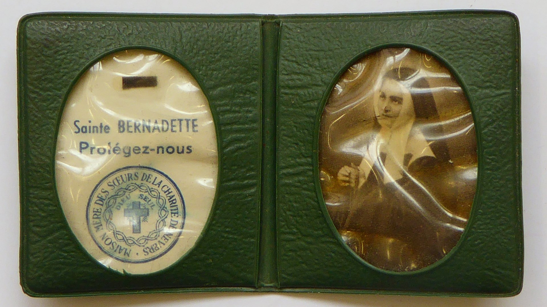 Groen mapje met afbeelding van H. Bernadette en stofreliek