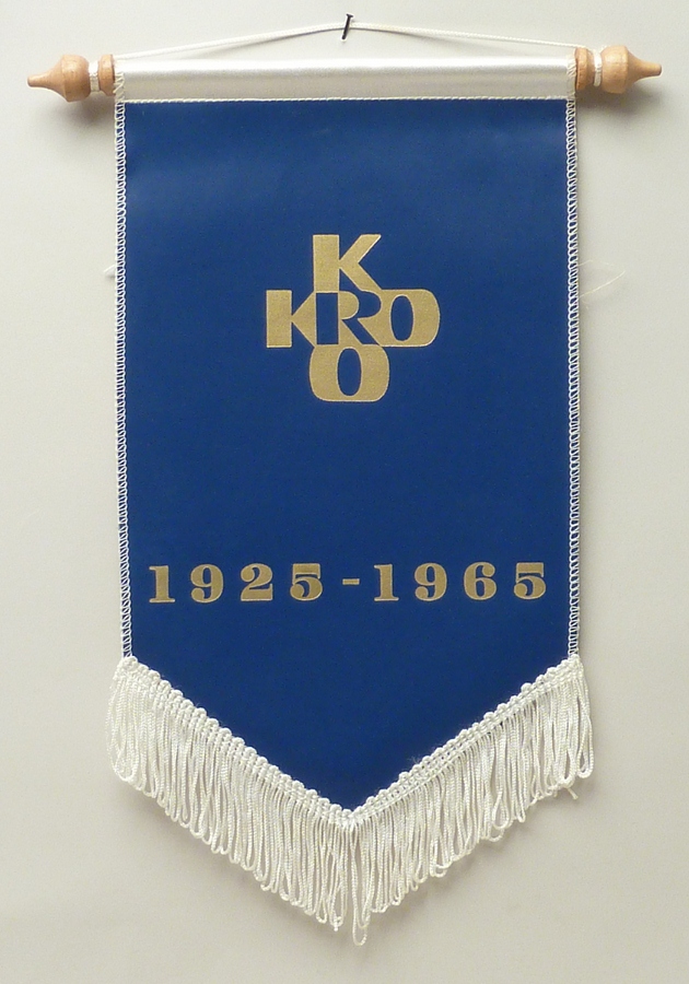 Blauwe vaan met embleem van de K.R.O. en "1925-1965", met franje