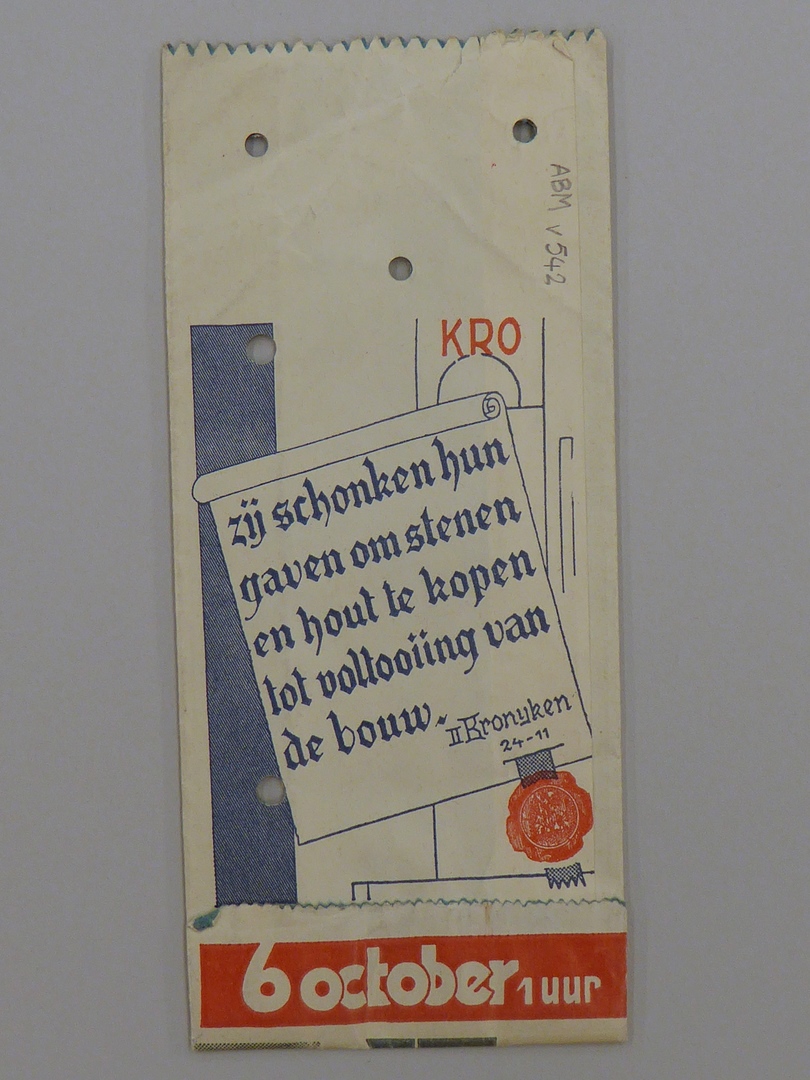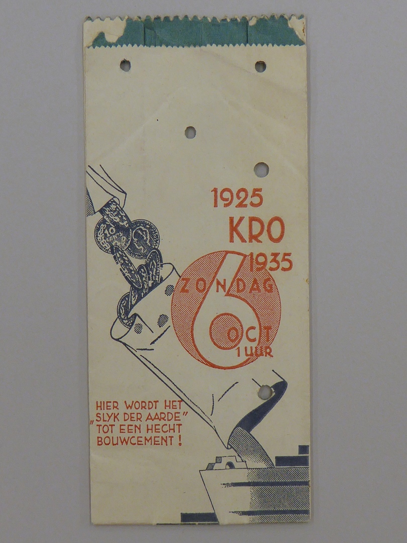 Papieren collectezakje voor jubileumfeestgave K.R.O. op 6 oktober 1 uur 1935